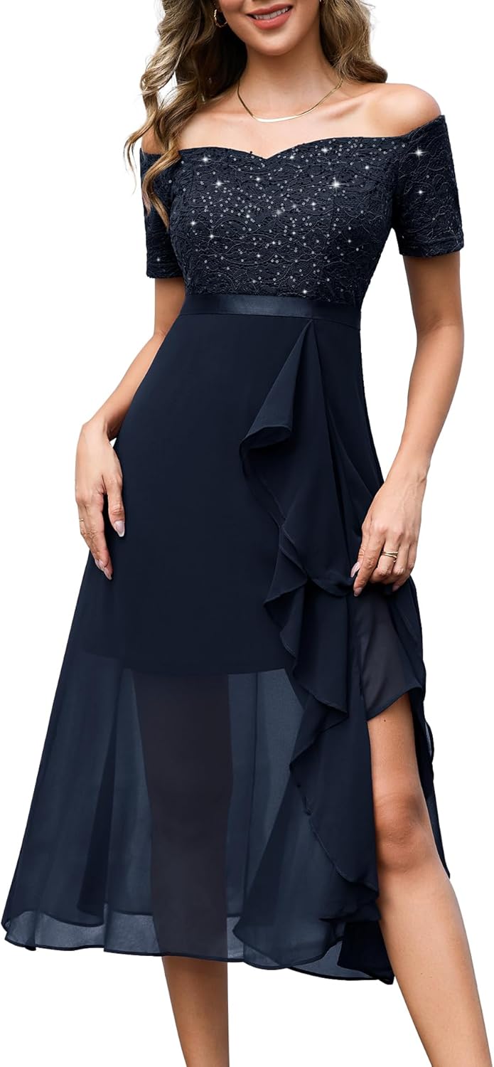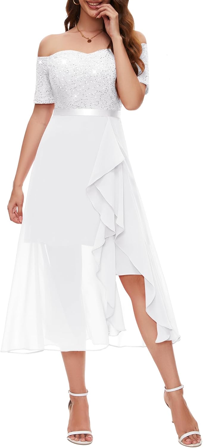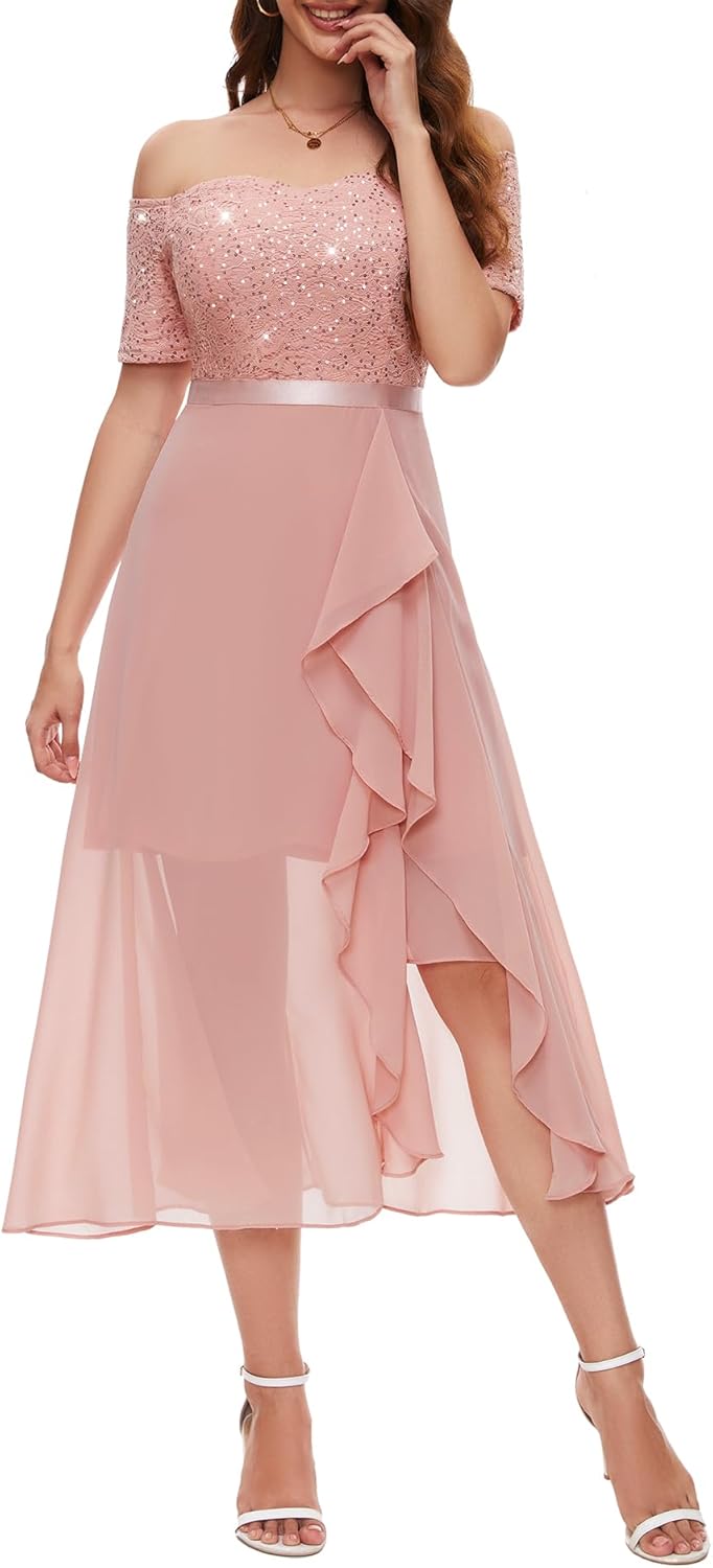 BeryLove Sequin Wedding Guest Bridesmaid Off Shoulder Long Ruffle Dress