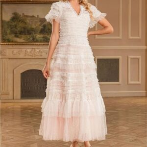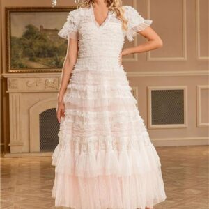DHFIRUFSHLO Women’s Ruffle Mesh Long Party Dress Short Sleeve Evening Dresses