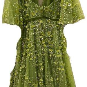 Make a stunning entrance in this breathtaking lime green evening gown. This show-stopping formal dress features intricate floral embellishments delicately arranged throughout the entire length. The dress is adorned with sparkling sequins that catch and reflect light with every movement, adding an ethereal shimmer to your special occasion. The long silhouette creates an elegant, flowing appearance perfect for formal events and wedding celebrations. The detailed craftsmanship is evident in every aspect, from the carefully placed floral appliques to the masterfully sewn sequin work. The dress combines sophistication with whimsical charm, making it an ideal choice for those seeking to make a memorable statement at formal gatherings.