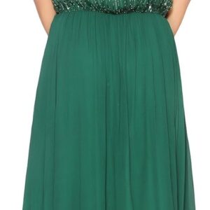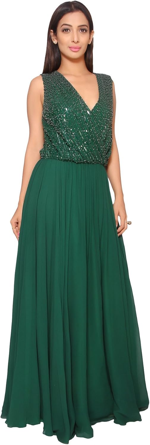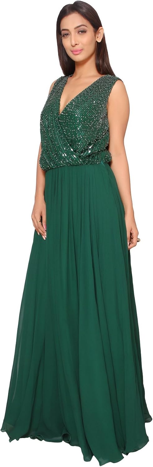 Emerald Green gown with overlap V-neck and HandEmbroidery in Georgette . Material: Georgette. Size: Small. Size:Small, Bust: 32-34, Waist: 26-28, Hip: 34-36
