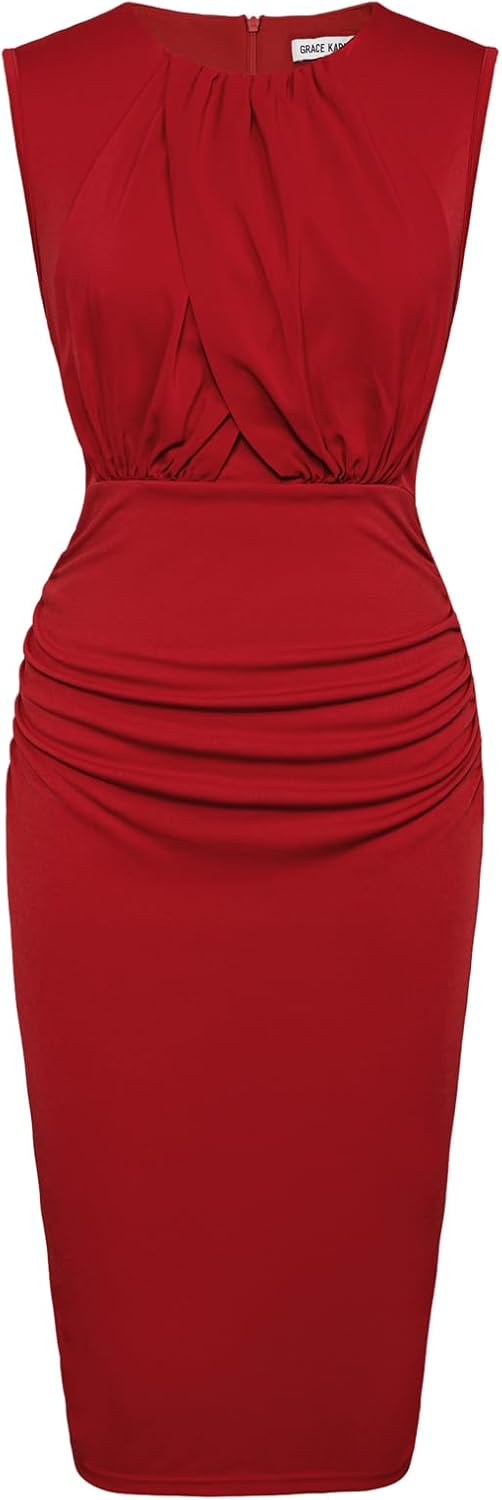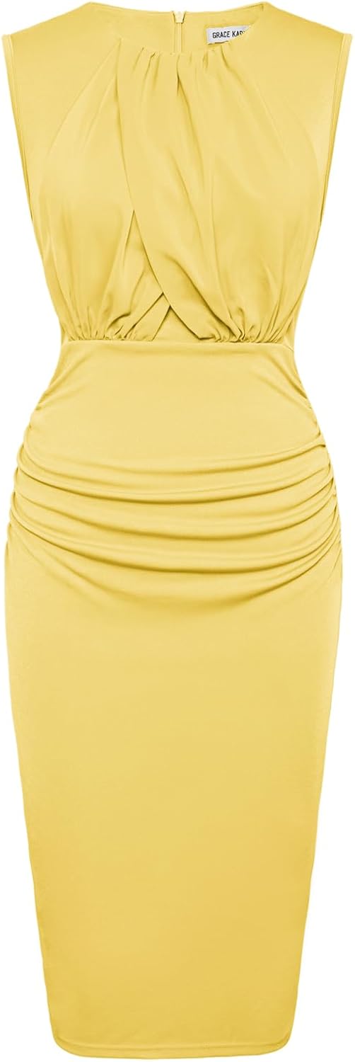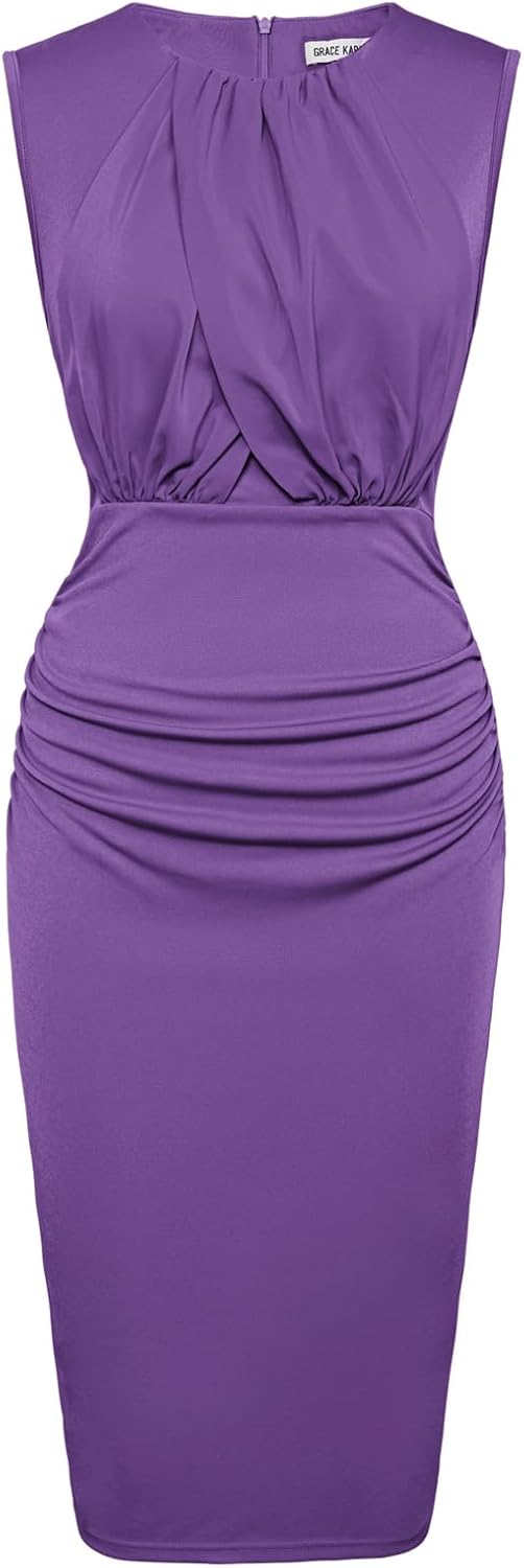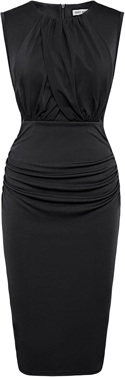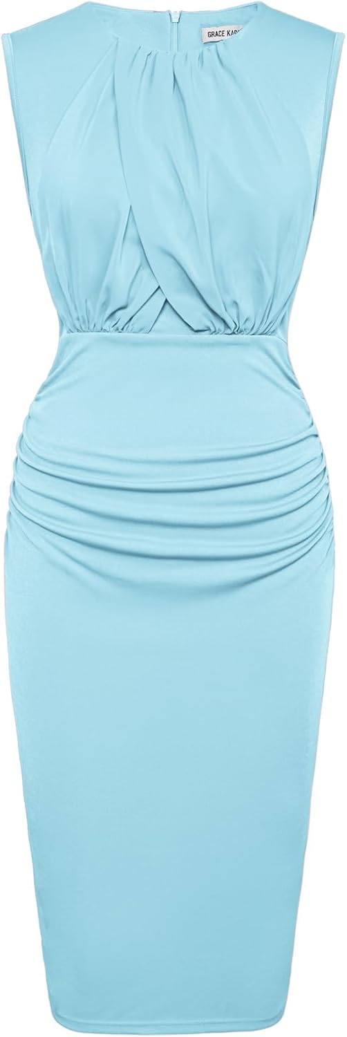 GRACE KARIN Women’s Ruched Bodycon Dress Summer Sleeveless Front Drape Patchwork Crew Neck Midi Cocktail Dress