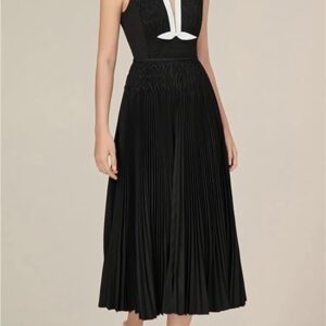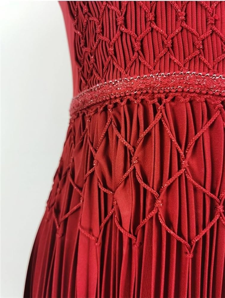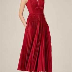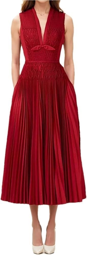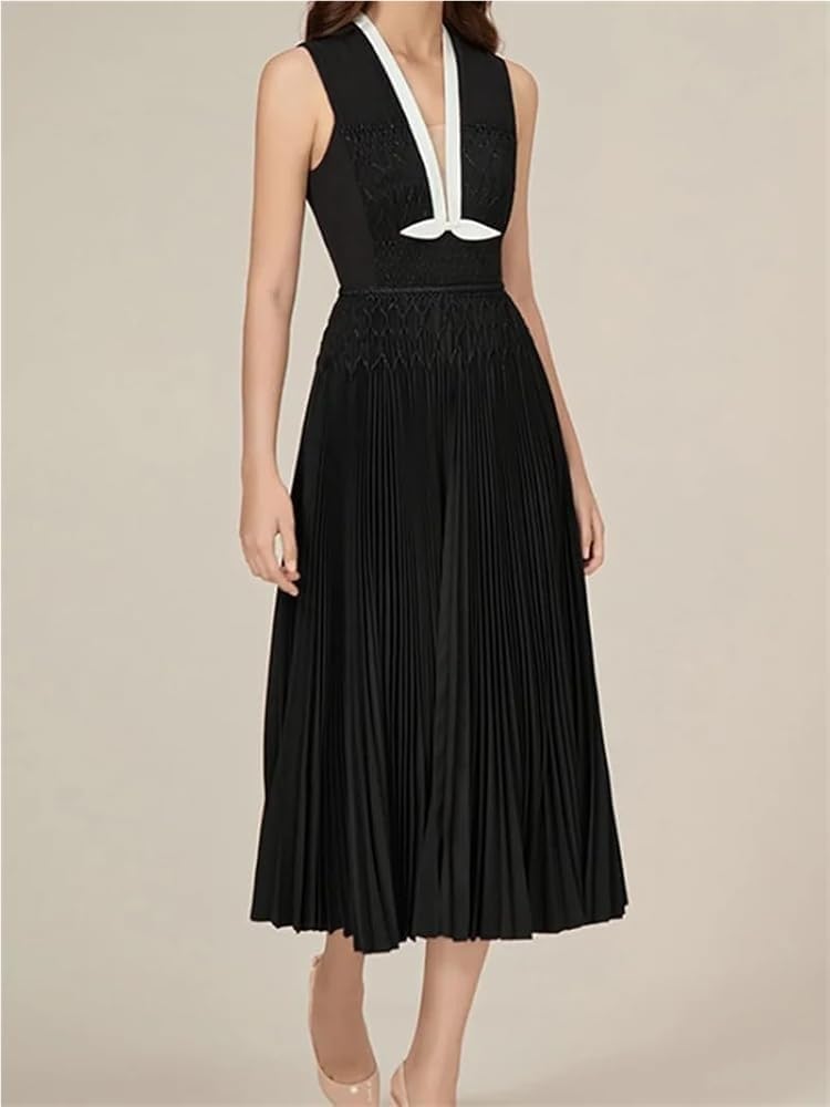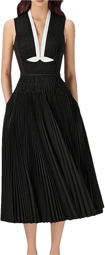 KswyyuwxgqI Women’s Deep V-Neck Sleeveless Evening Dress Pleated Zipper Contrast Color Line Waist Formal Dresses