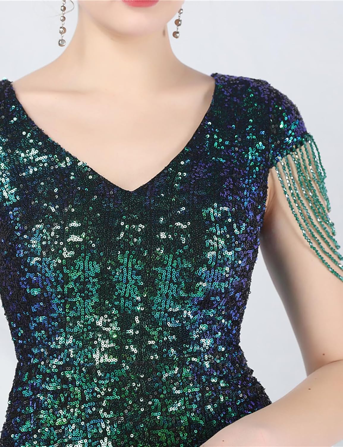 - The 1920s maxi sequin formal dress is so feminine and fresh with V neck, long beads tassel sleeve cocktail dress, back zipper floor length party dresses.