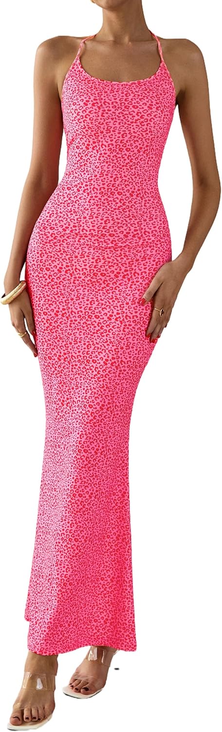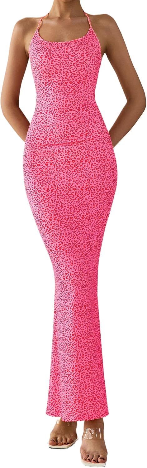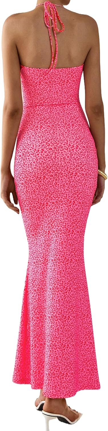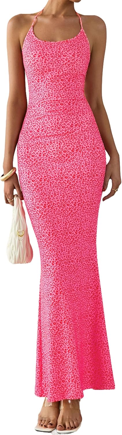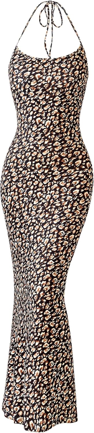 PRETTYGARDEN Maxi Dresses for Women 2025 Summer Halter Leopard Print Backless Sexy Bodycon Cocktail Beach Long Dress