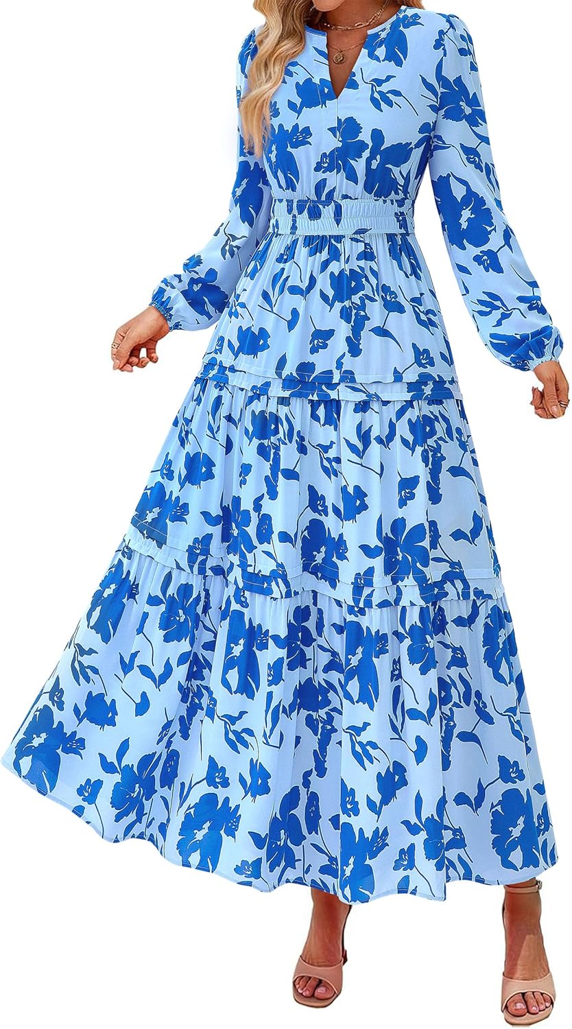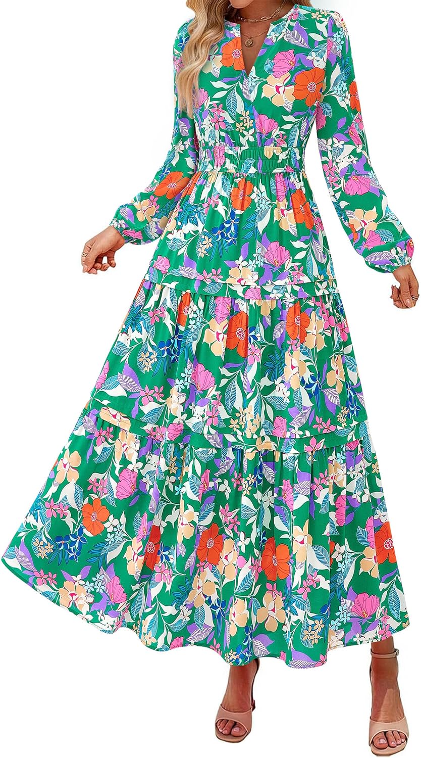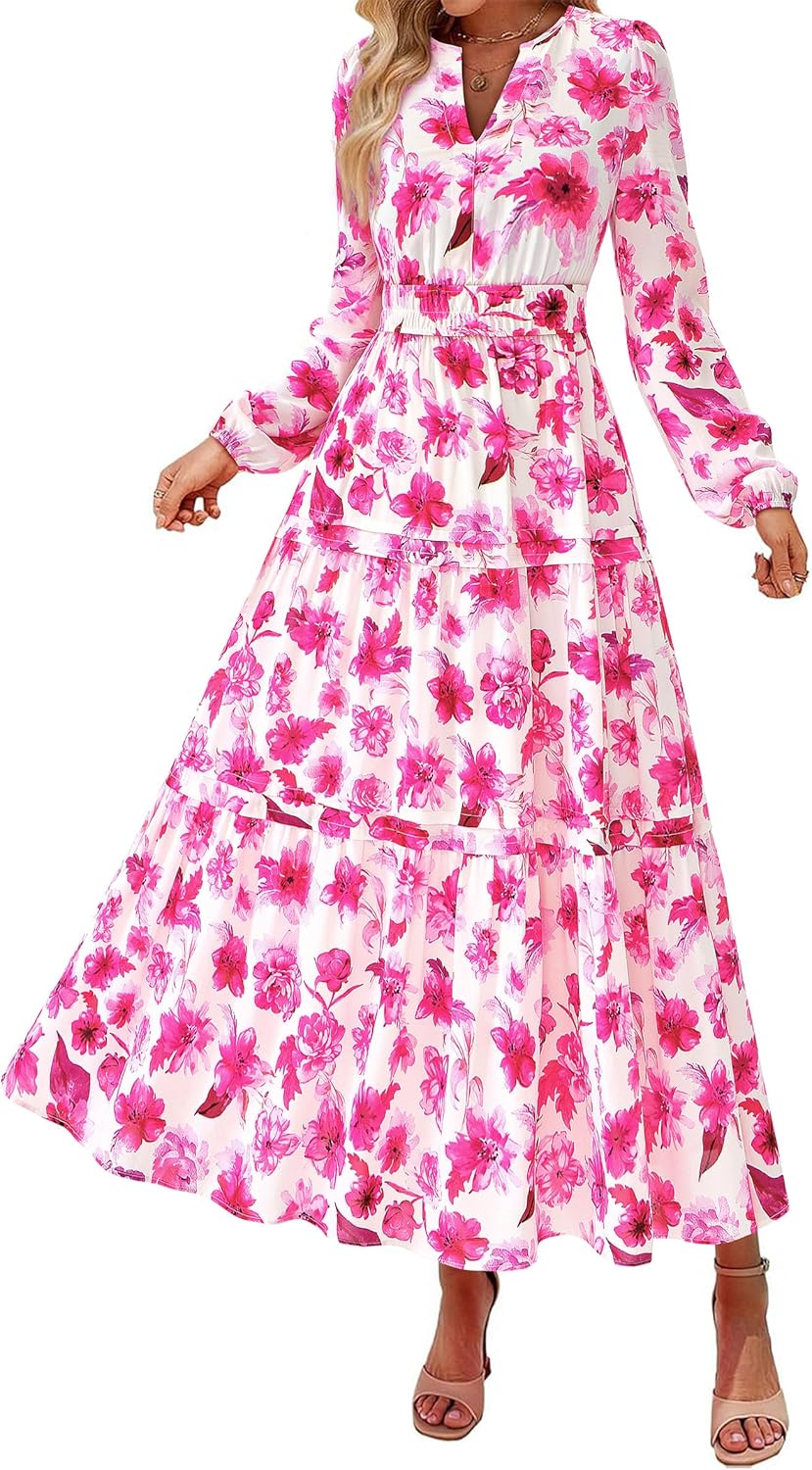 PRETTYGARDEN Women’s 2025 Fall Boho Maxi Dresses Floral Long Sleeve V Neck Flowy Elegant Wedding Guest Dress Vacation Outfits