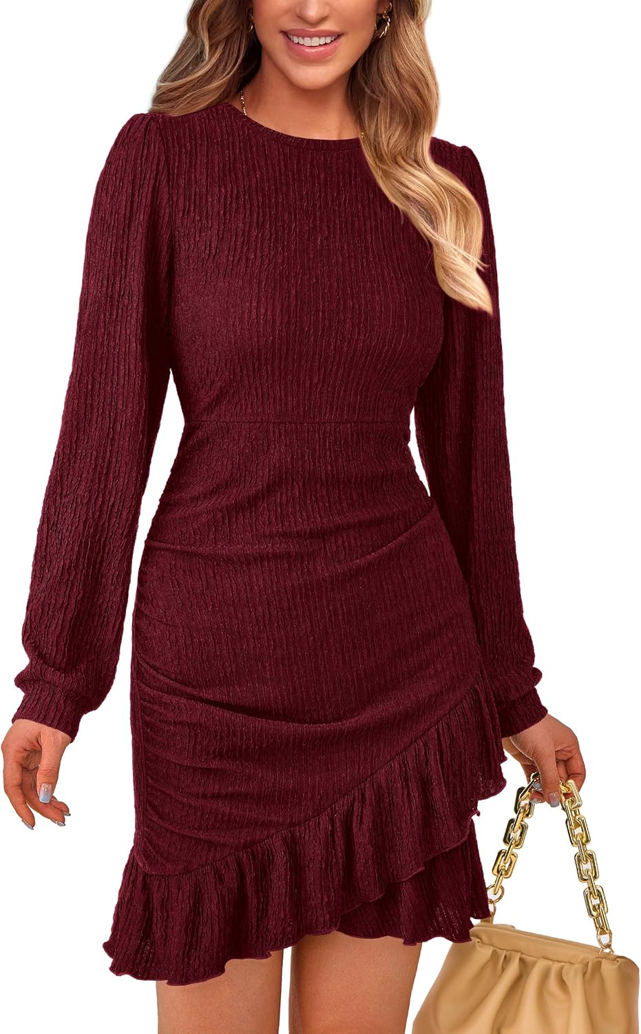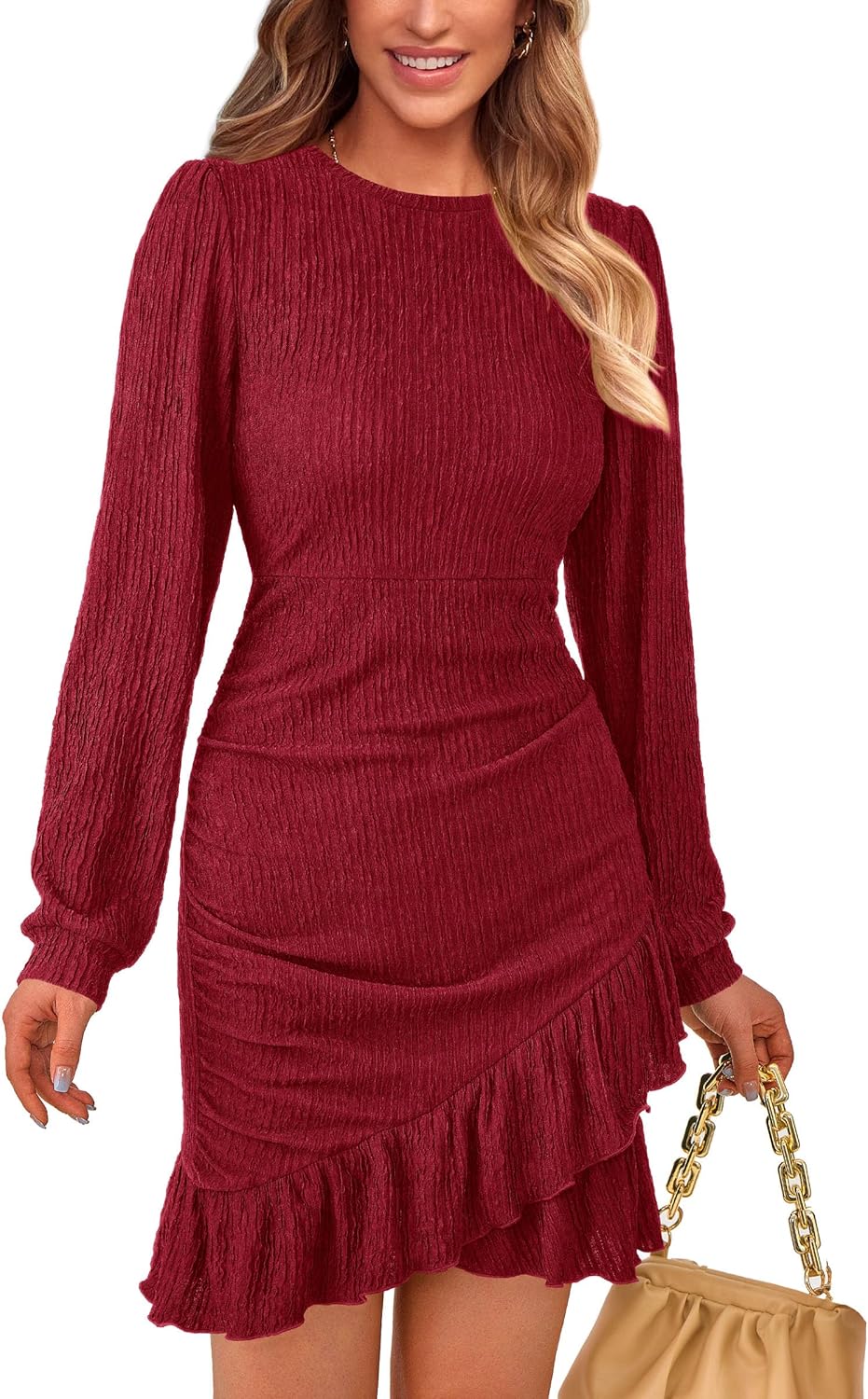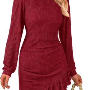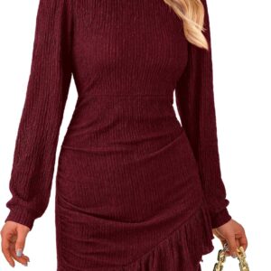 PRETTYGARDEN Women’s Spring Fall Ruched Bodycon Mini Dress Long Puff Sleeve Ruffle Fitted Cocktail Party Dresses