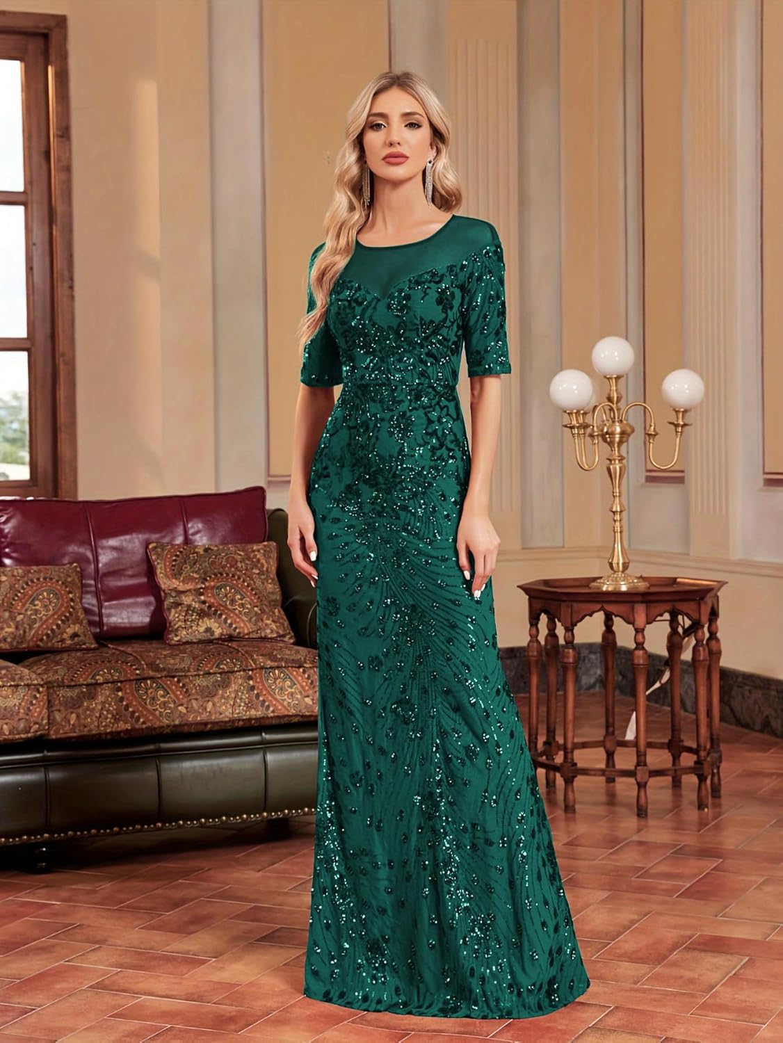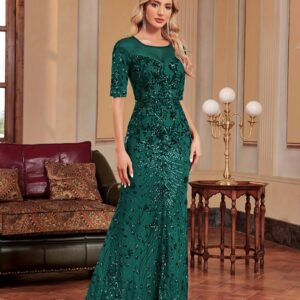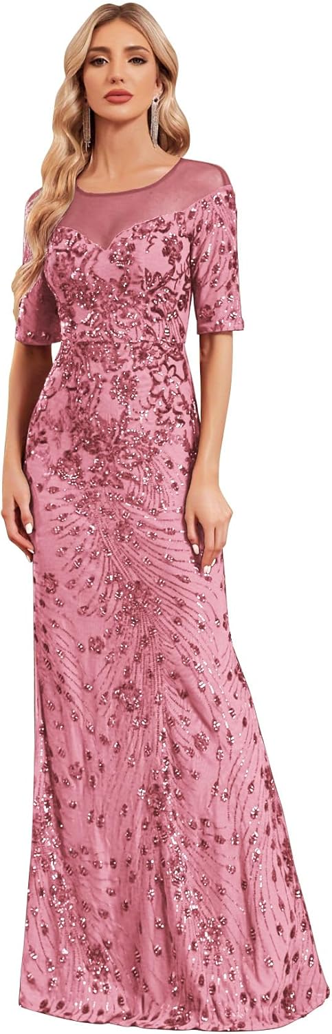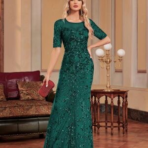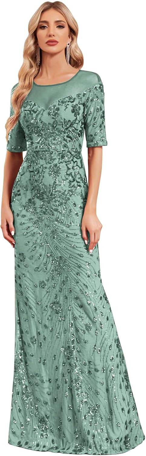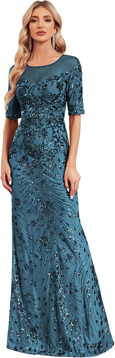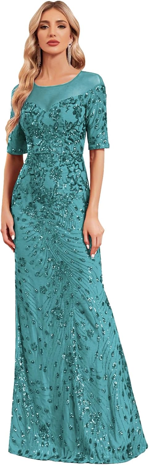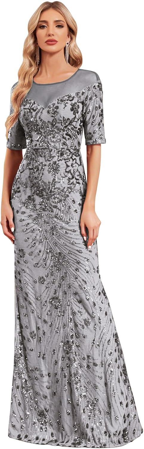 Short Sleeve Glitter Mermaid Evening Dress for Mother of The Bride Patchwork Women’s Sequin Formal Gown