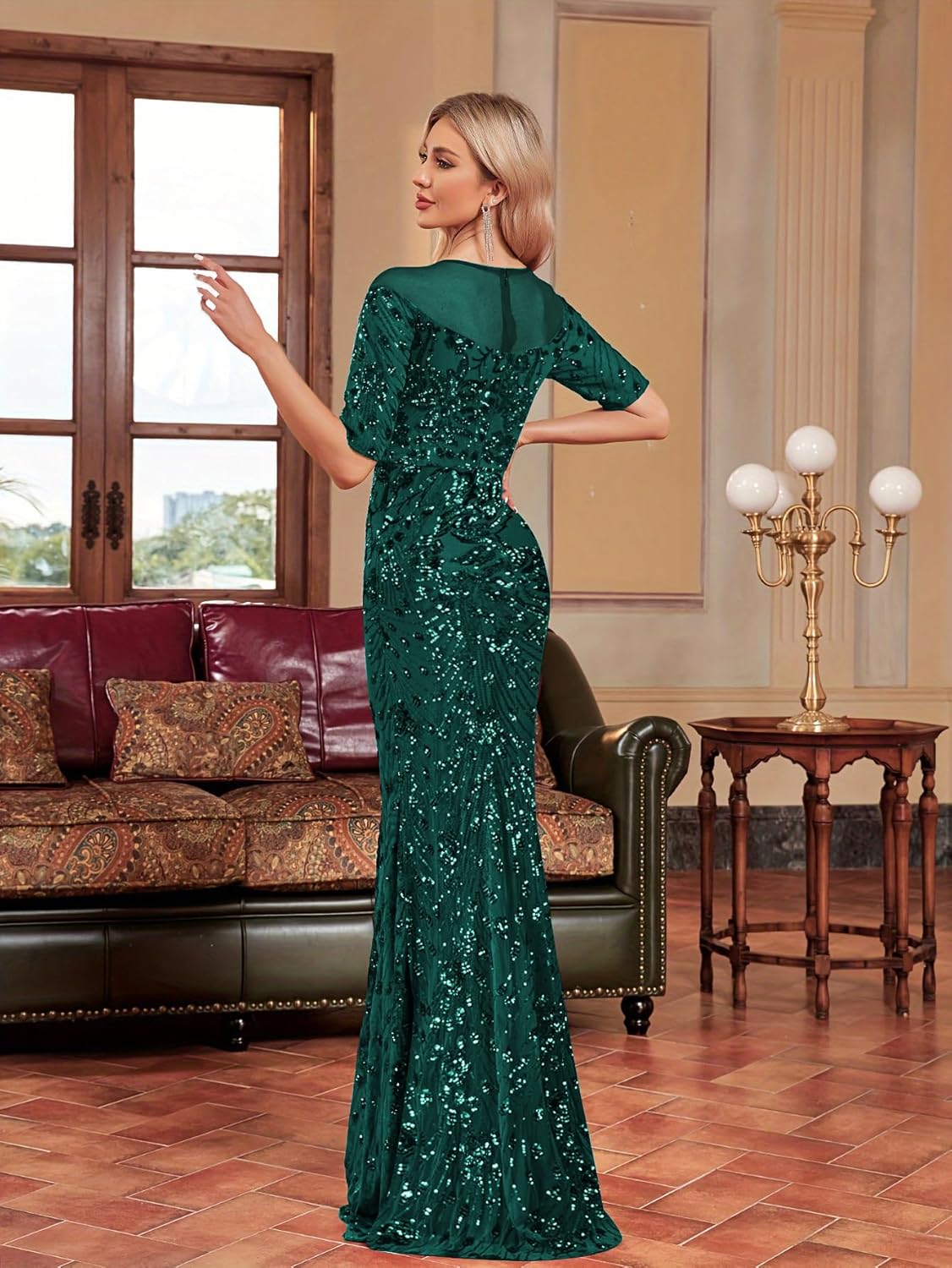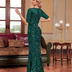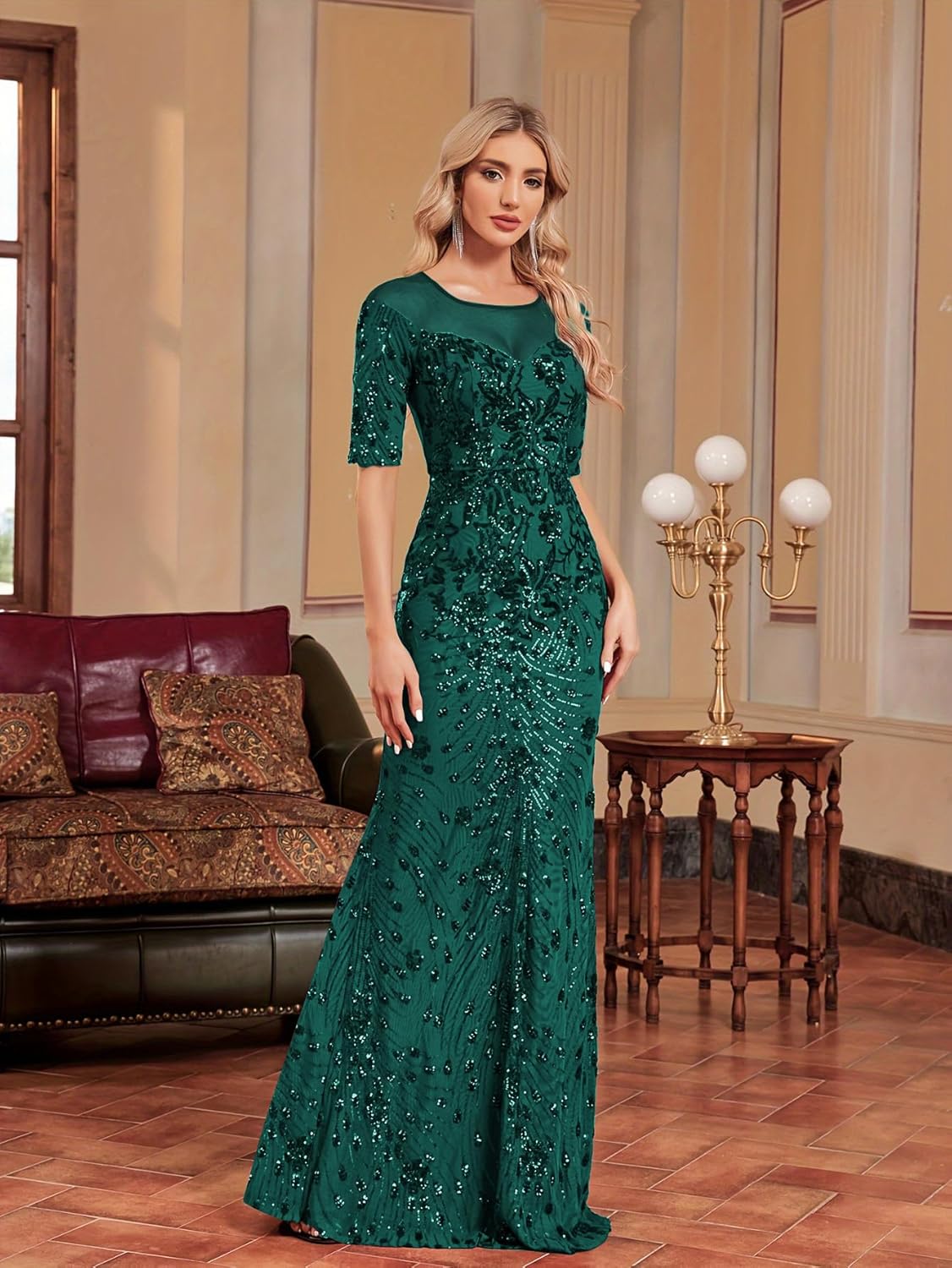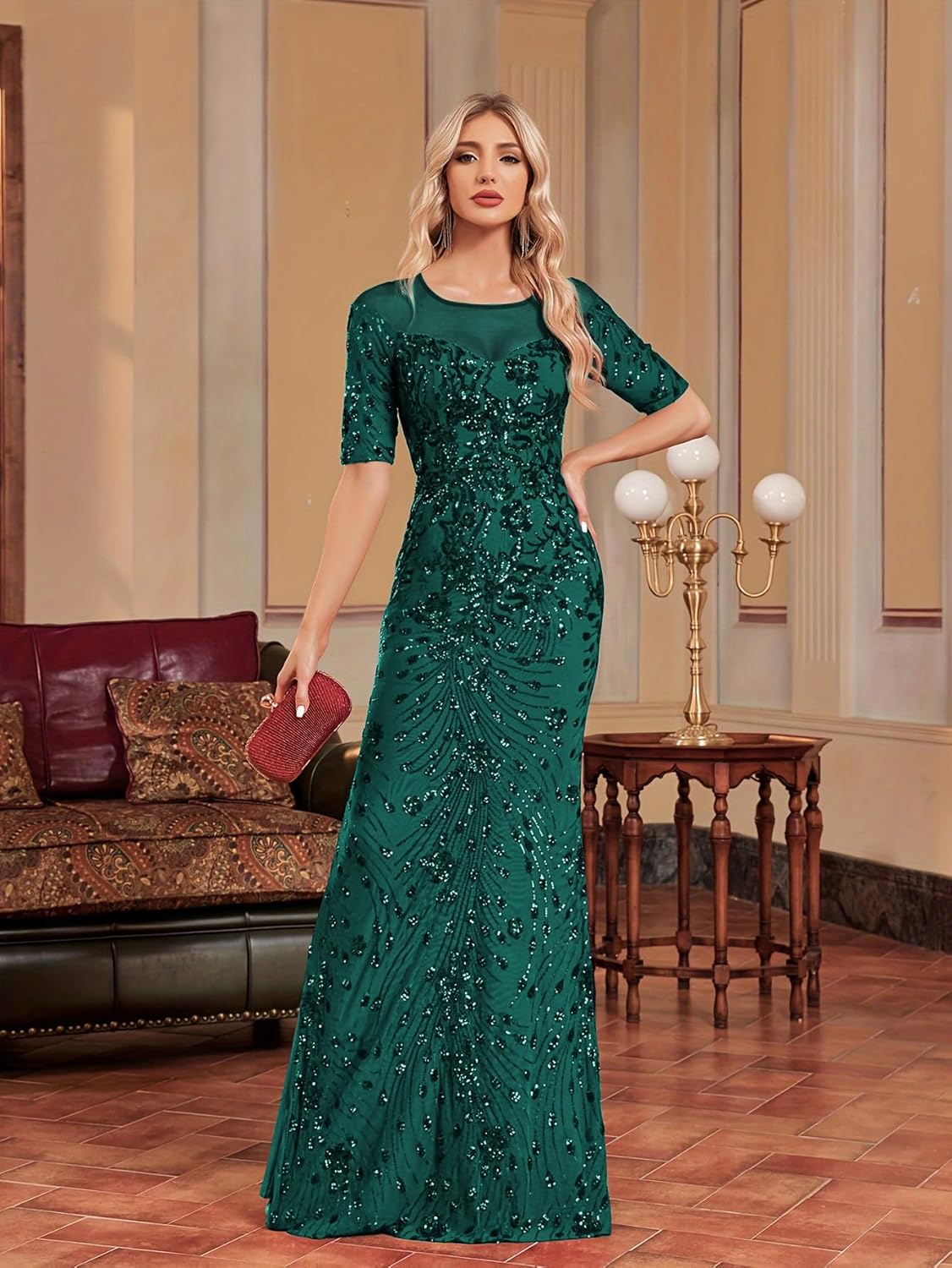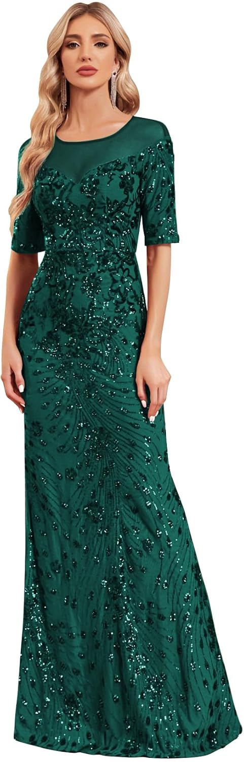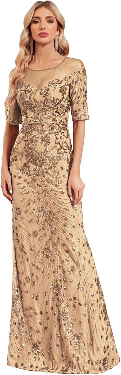 Short Sleeve Glitter Mermaid Evening Dress for Mother of The Bride Patchwork Women’s Sequin Formal Gown