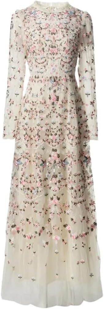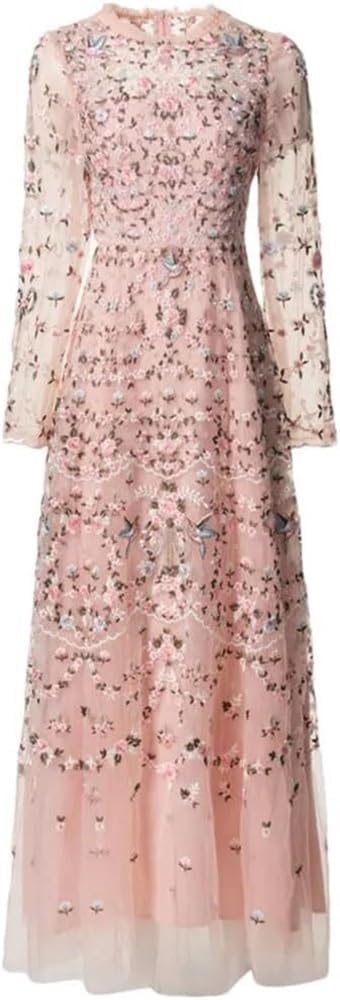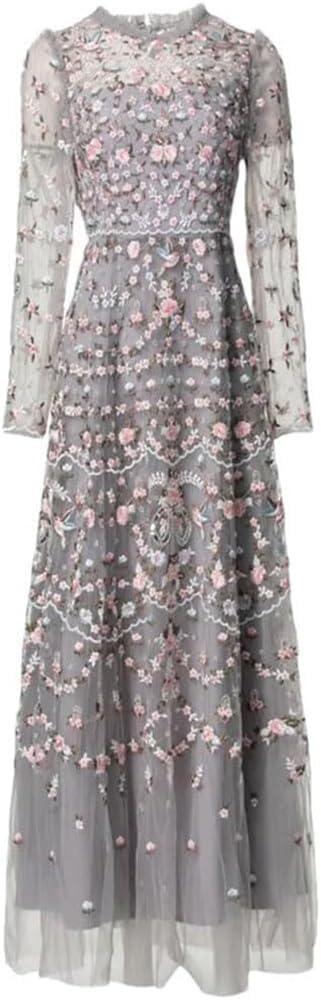 Women’s Elegant Hollow Out Embroidery Evening Dress O Neck Long Sleeve Wedding Guest Party Maxi Dresses