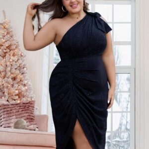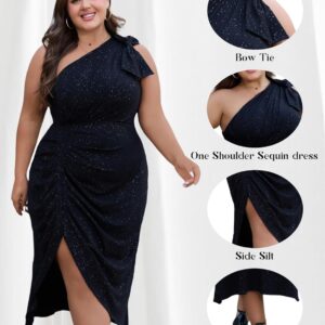 Women’s Summer Plus Size Sequin Glitter Dress One Sparkly Shoulder Ruched Wrap Cocktail Party Black Slit Dress