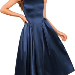 Womens 2025 Sleeveless Boat Neck A Line Satin Cocktail Prom Midi Dress