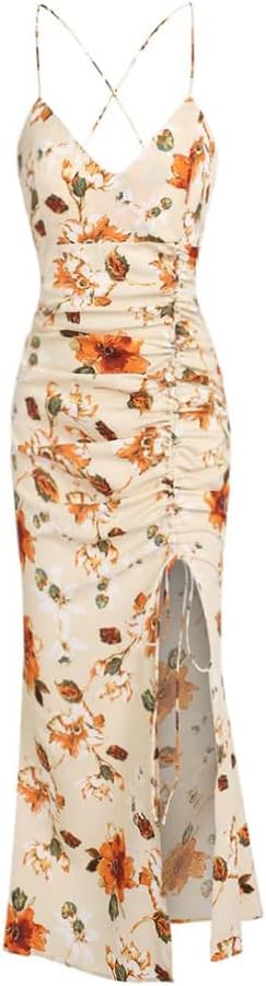 ZAFUL Womens Summer Floral Spaghetti Midi Dresses 2025 Sexy V Neck Sleeveless Drawstring Ruched Split Backless Cocktail Dress