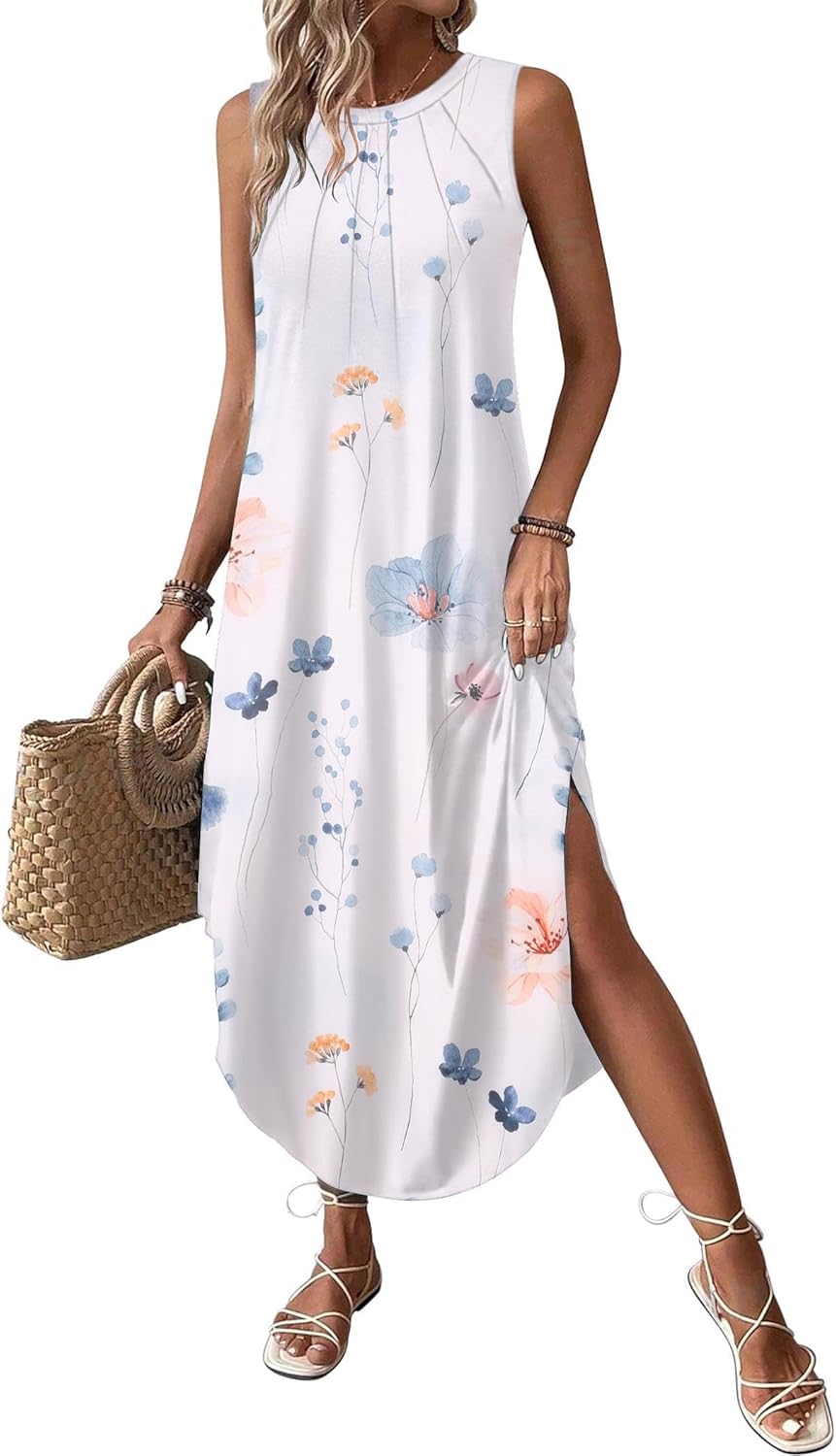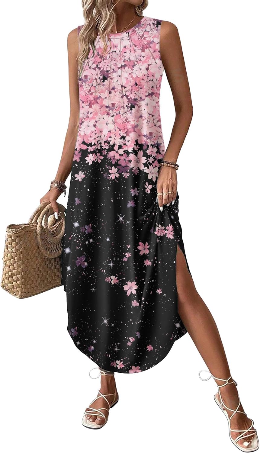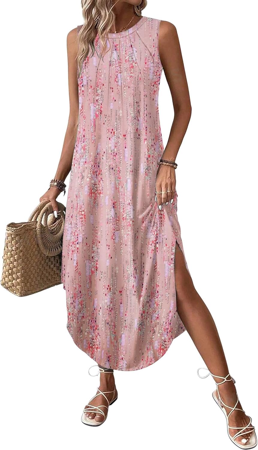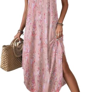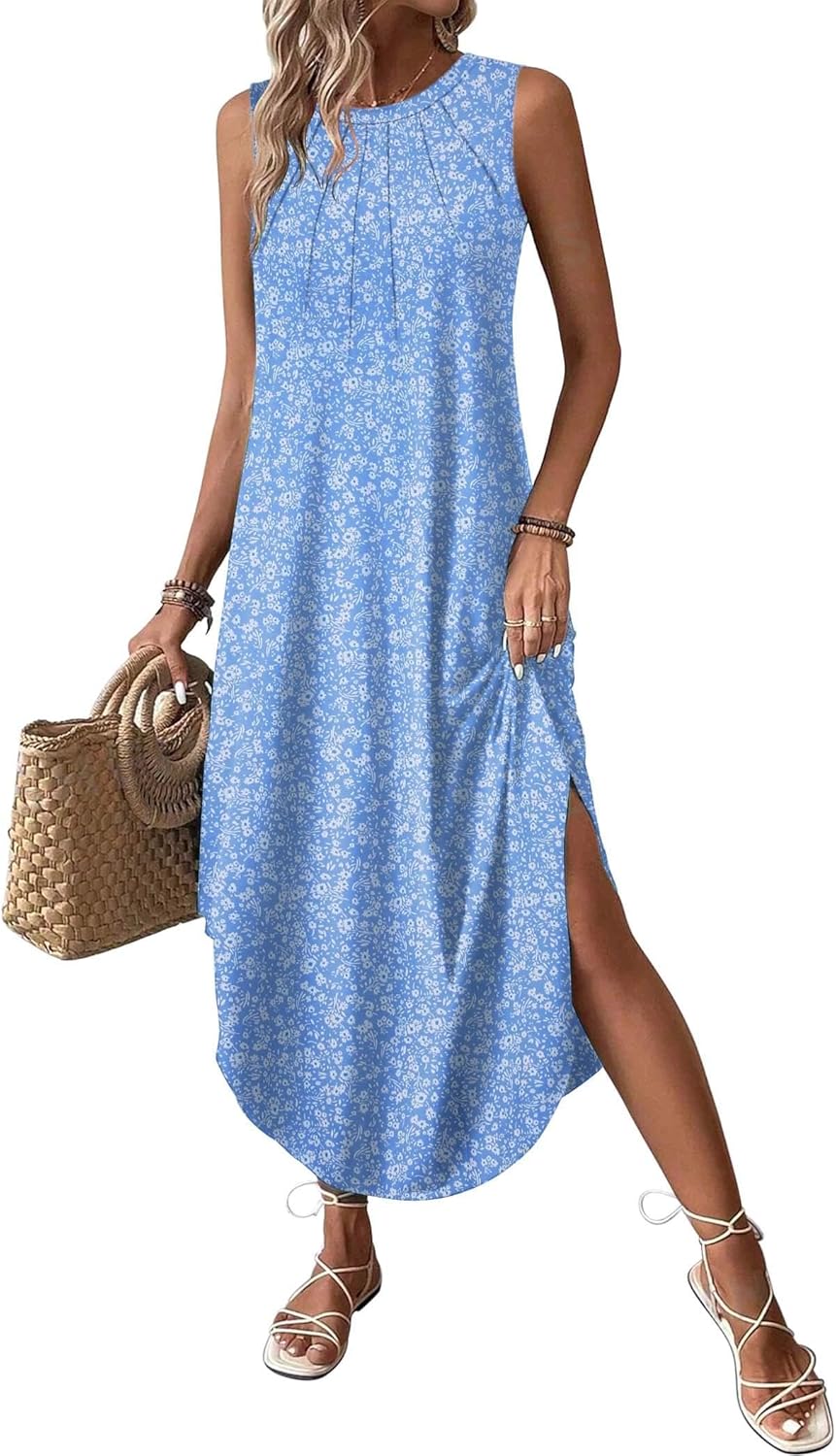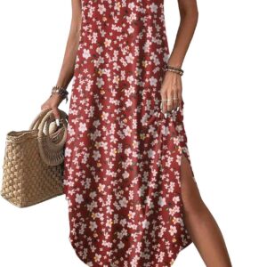 Zeagoo Women Floral Summer Casual Beach Printed Tank Dress with Pockets Pleated Front Long Dress