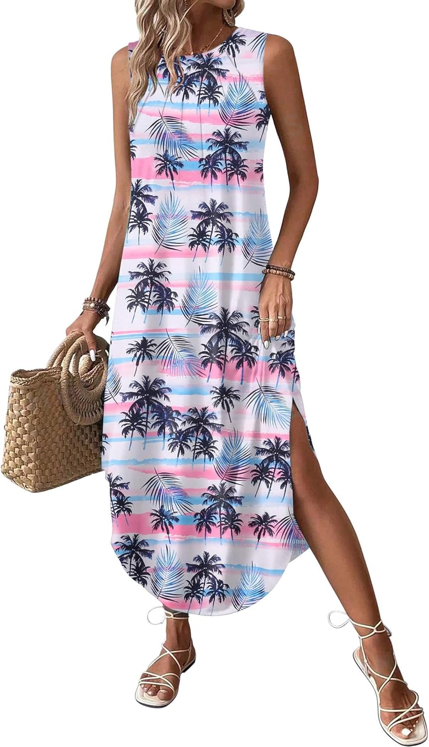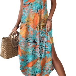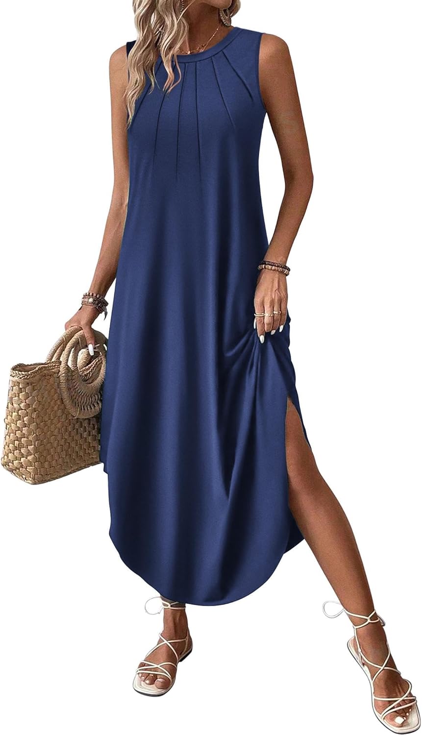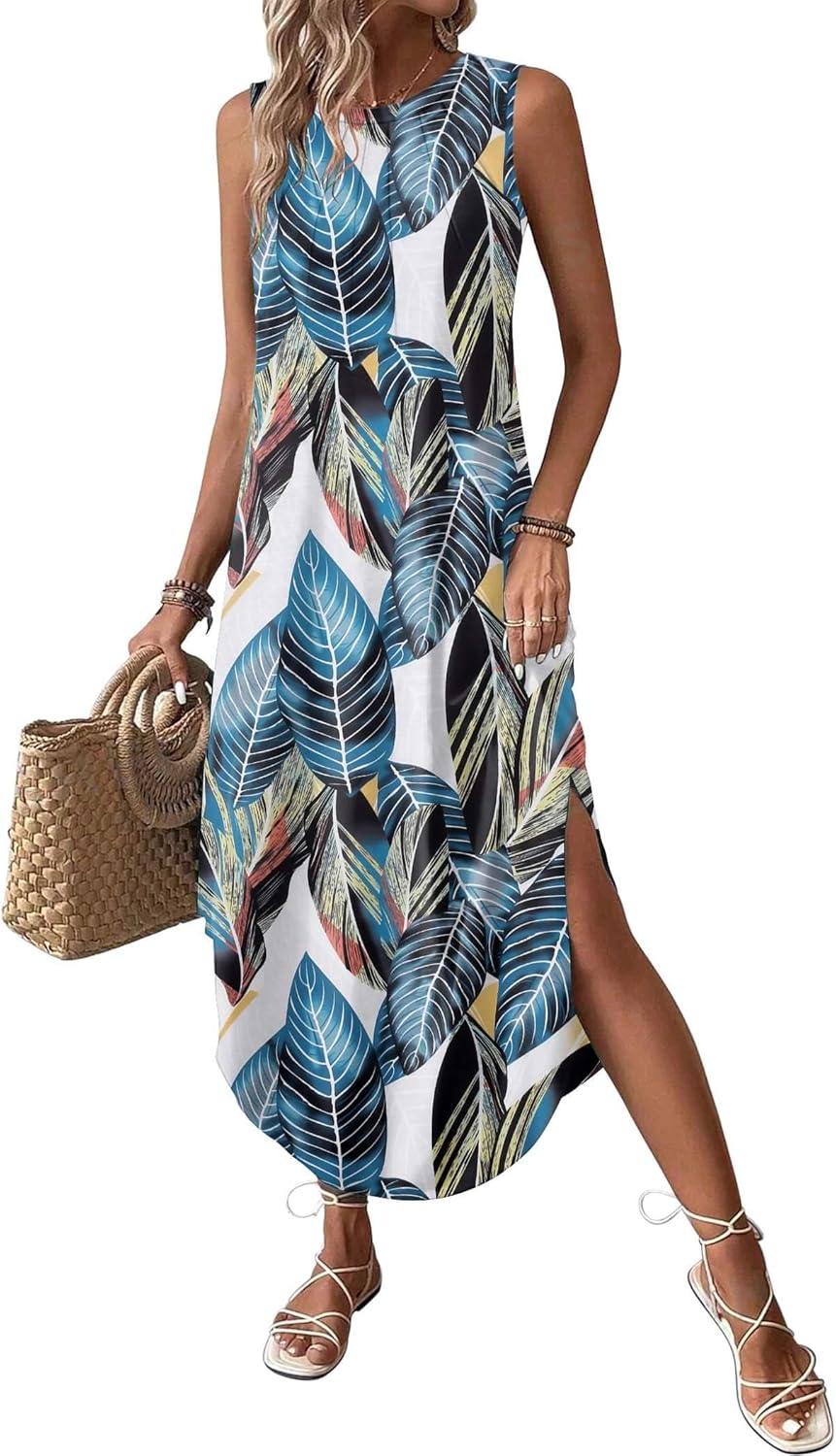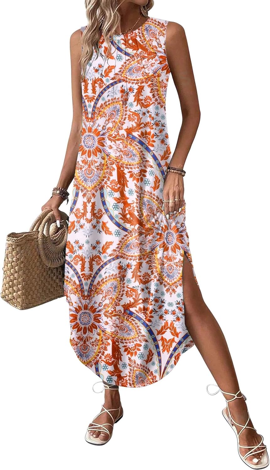 Zeagoo Women Floral Summer Casual Beach Printed Tank Dress with Pockets Pleated Front Long Dress